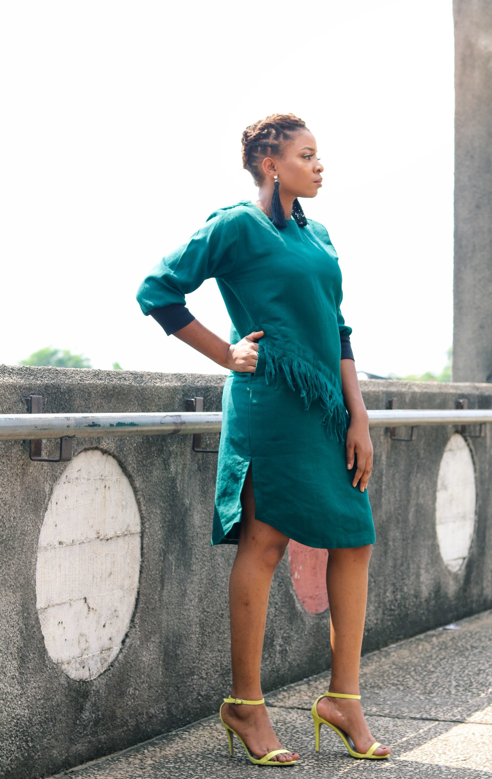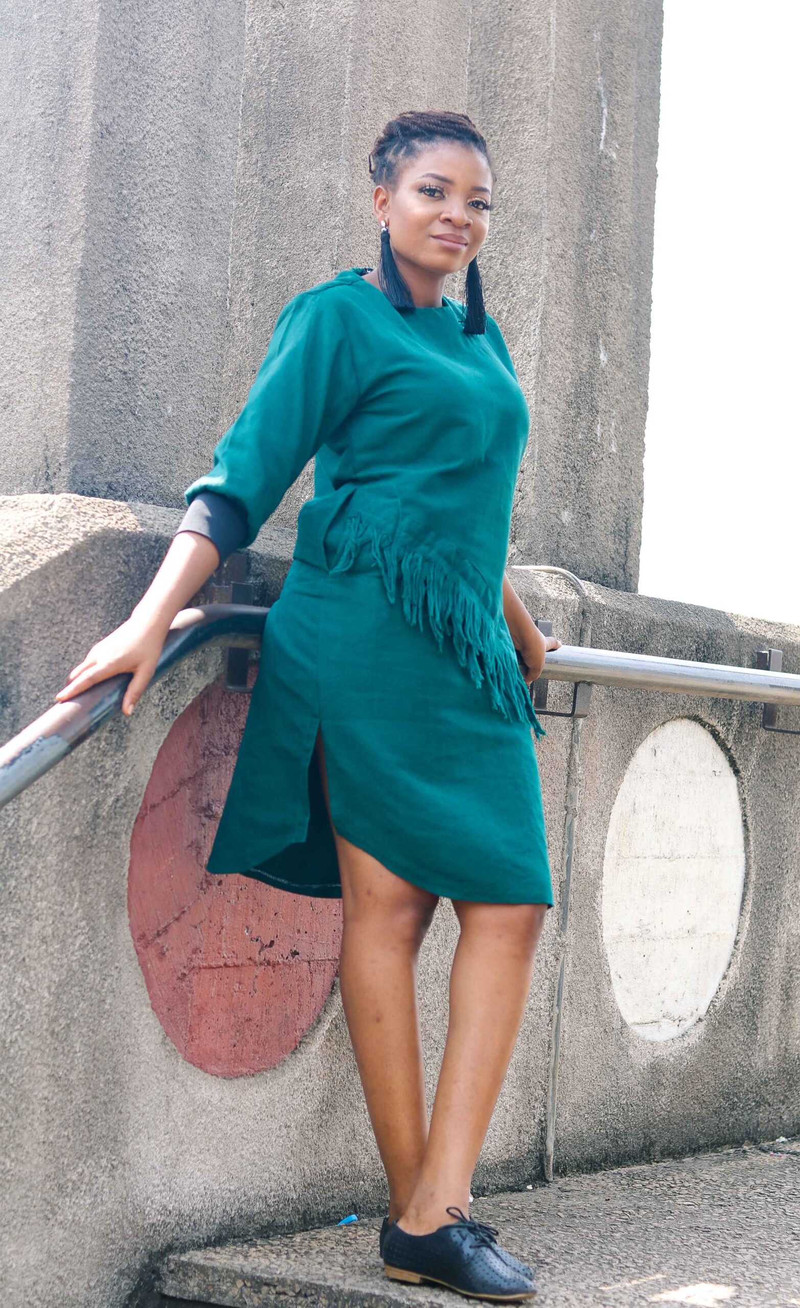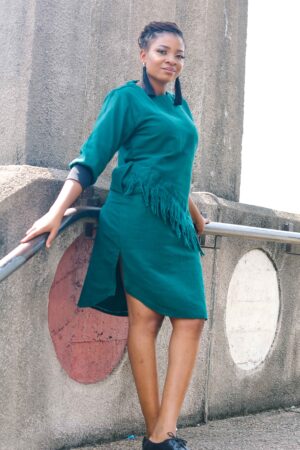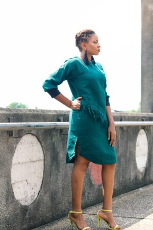 Asake Dress – The Green Dress with Elastic Sleeves. It’s 100% Aso-oke, stylish, breathable and with a soft cottony feel.