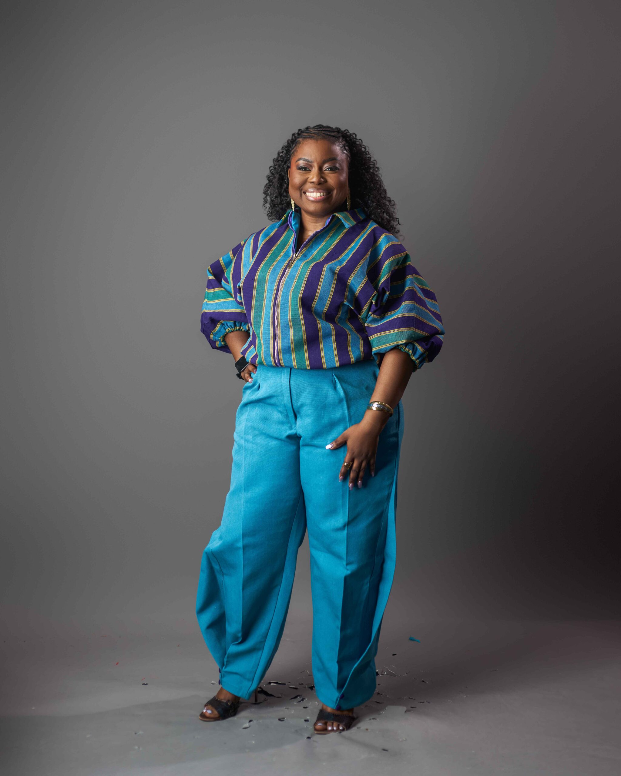A blouse with structured detailing pairs with a coordinating midi skirt, blending bold vintage charm with modern tailoring. The front pockets and sculpted panels add purposeful elegance, while the rich hue celebrates Agbeke’s 10-year journey. Legacy stands for heritage, strength, and the enduring spirit of style reimagined.